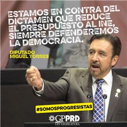El Grupo Parlamentario del Partido de la Revolución Democrática (GPPRD), en voz del zacatecano Miguel Torres, manifestó su rechazo al dictamen que incumple la sentencia de la Suprema Corte de Justicia de la Nación (SCJN), que instruyó a la Cámara de Diputados fundamentar la modificación que hizo al anteproyecto presupuestal del Instituto Nacional Electoral (INE), para quitarle casi 5 mil millones de pesos para el ejercicio del presente año, equivalente al 26 por ciento.